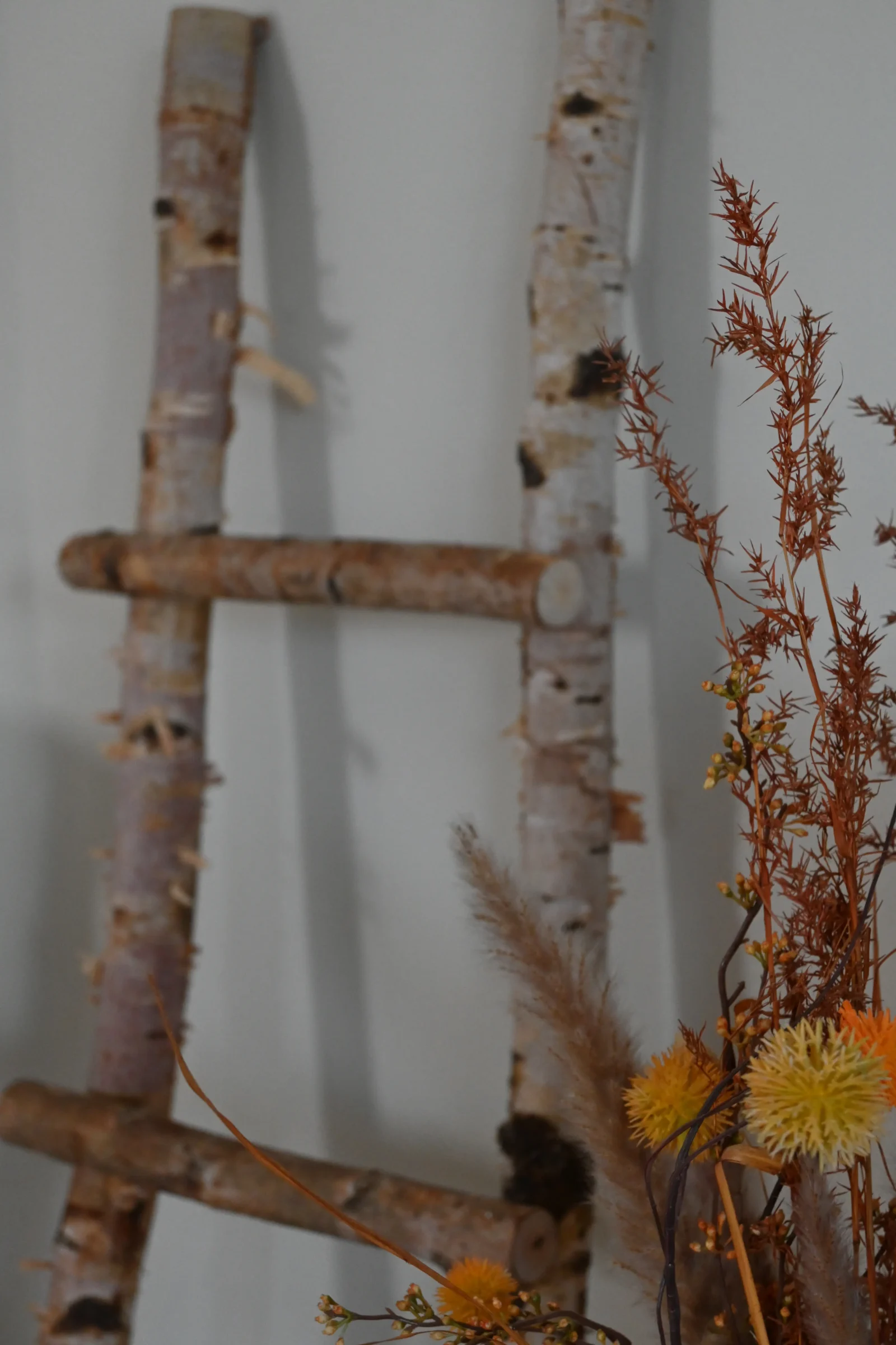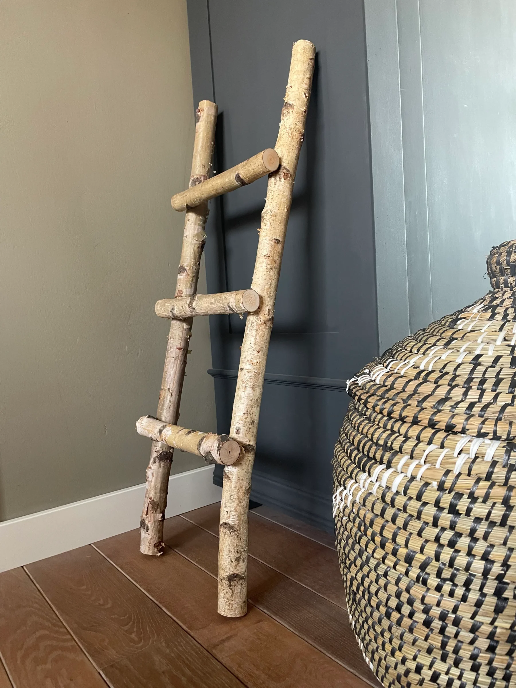 De Alvar decoratieladder is gemaakt van berkenstammen met bast, waardoor elke ladder een unieke, robuuste uitstraling heeft. Het natuurlijke berkenhout brengt warmte en karakter in huis en past zowel in een landelijk als industrieel interieur.