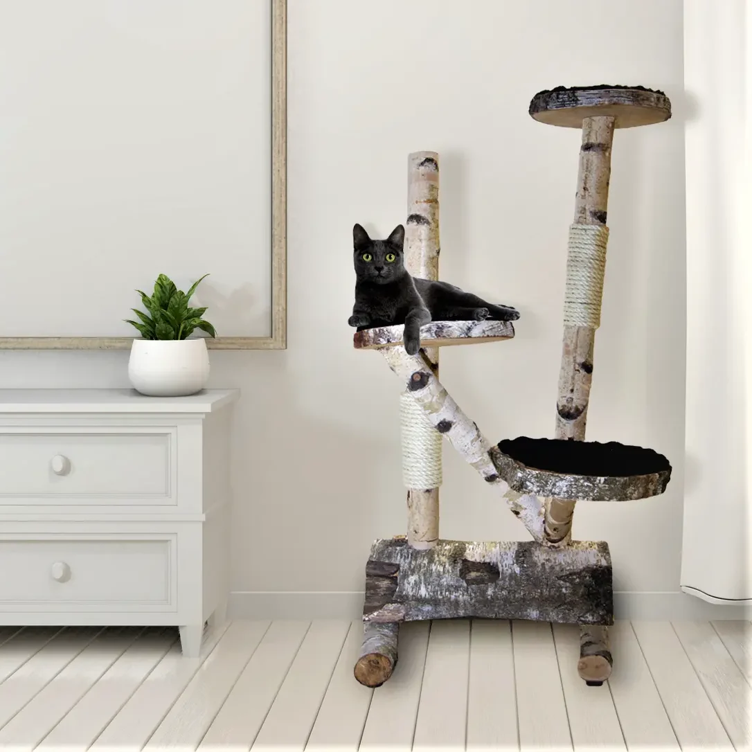 De berken krabpaal Nala is een unieke en natuurlijke krabpaal, gemaakt van robuuste berkenstammen. Dankzij de stevige constructie en de verschillende plateaus biedt deze krabpaal jouw kat volop mogelijkheden om te spelen, klimmen, rusten en uitkijken.
