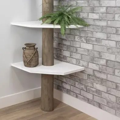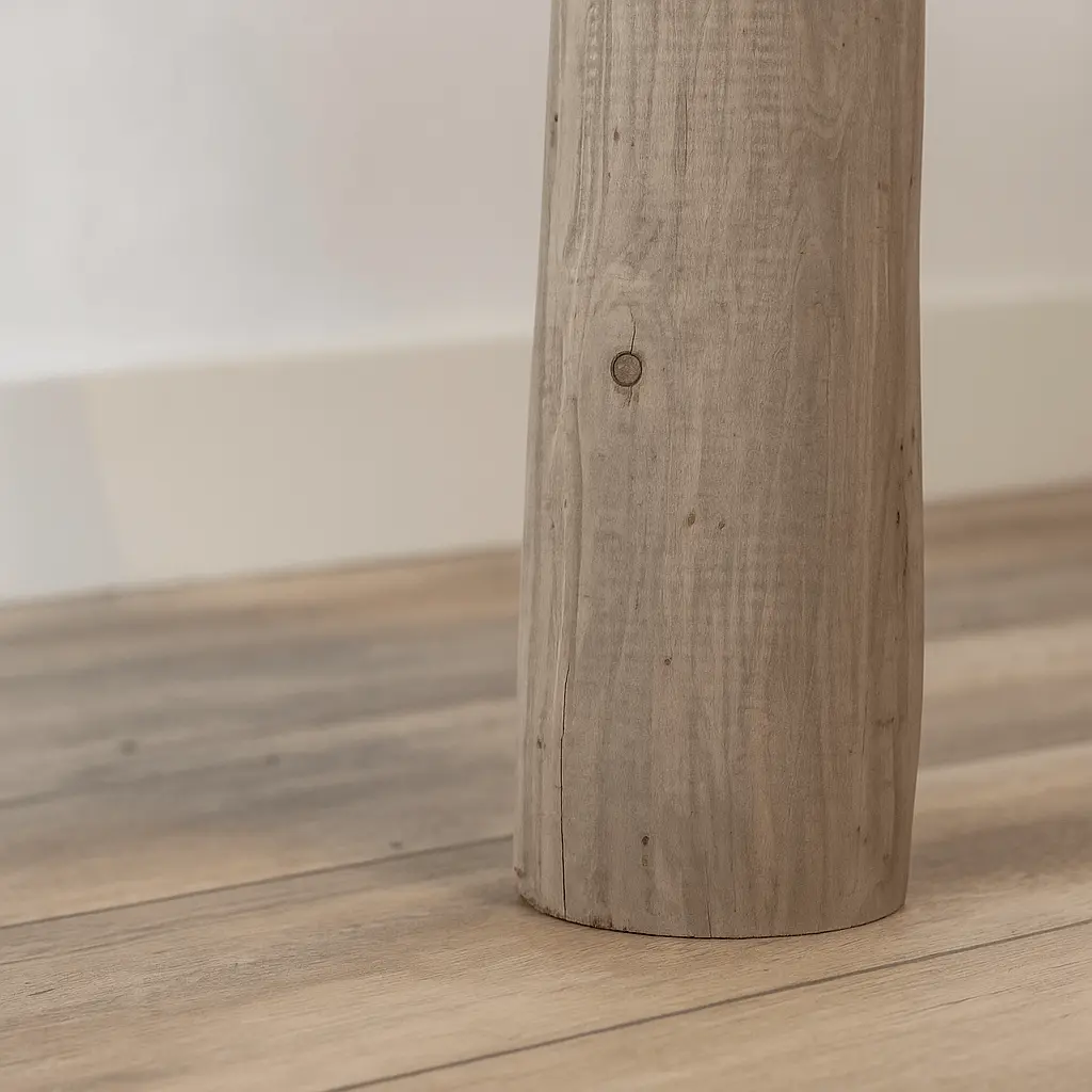 Deze boomstam hoekkast verandert een onbenutte hoek in een echte eyecatcher. De massieve boomstam vormt de natuurlijke ruggengraat en is afgewerkt met een warme Grey wash olie. De organische vorm van het hout vormt een prachtig geheel met de strak uitgevoerde witte planken, die rondom de stam lijken te zweven.