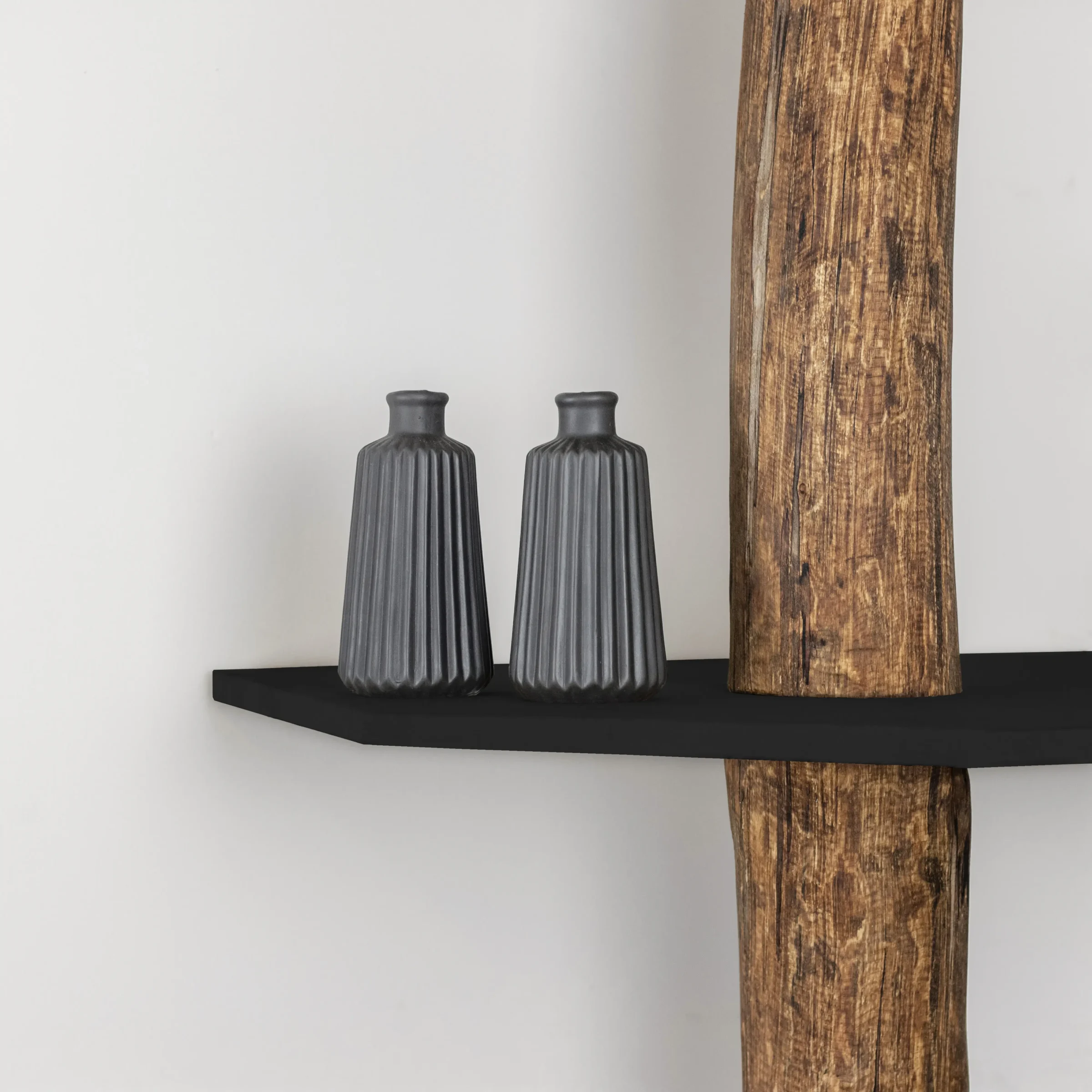 Odin boomstam hoekkast met natuurlijke boomstam behandeld met een Oak olie en 4 zwarte hoekplanken.