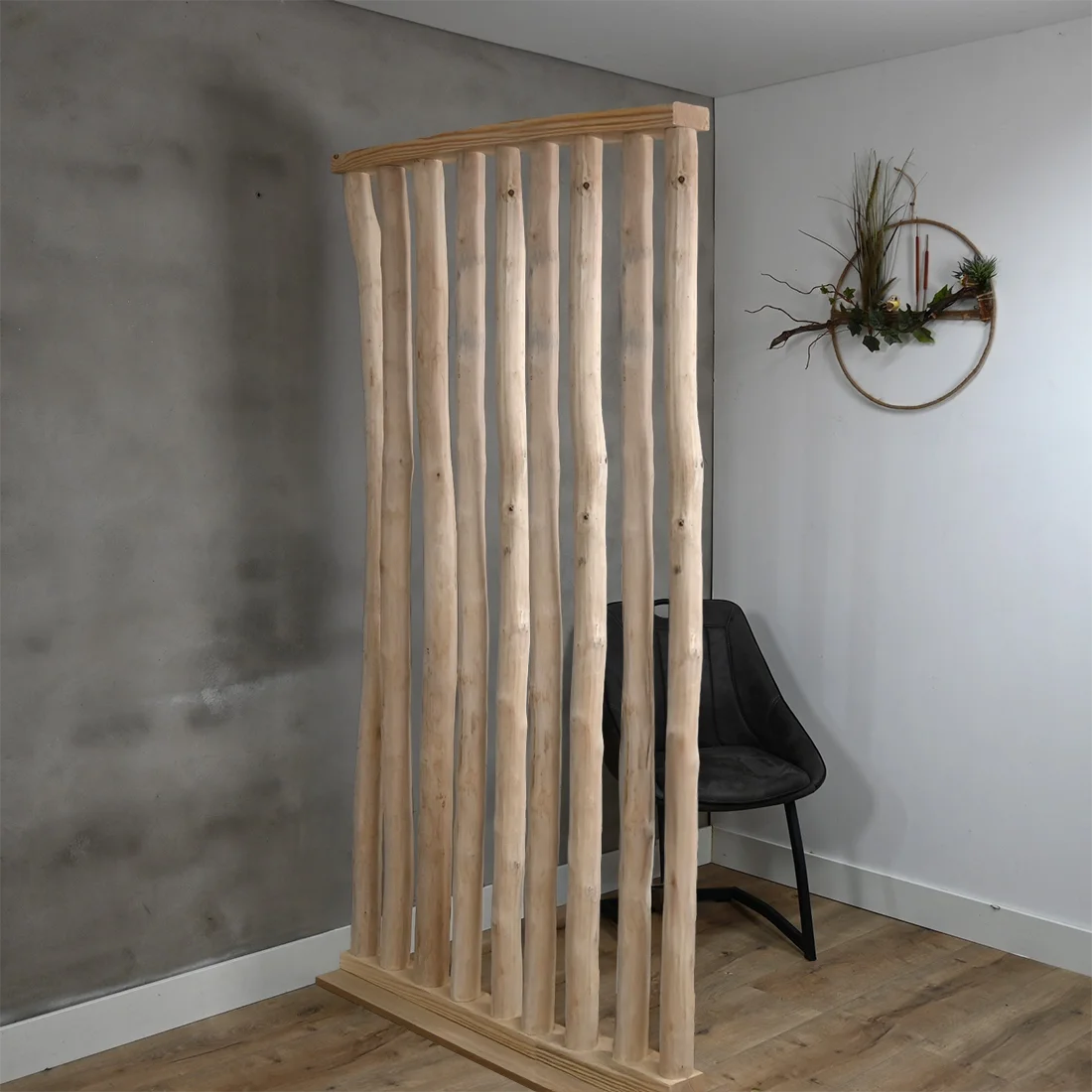 De stammen zijn stevig geplaatst in een naturel houten voet, wat het geheel een warme en harmonieuze look geeft. Met zijn tijdloze en minimalistische ontwerp is deze roomdivider ideaal als stijlvolle afscheiding tussen leefruimtes, of als decoratief element dat sfeer toevoegt aan kantoor, horeca of showroom.