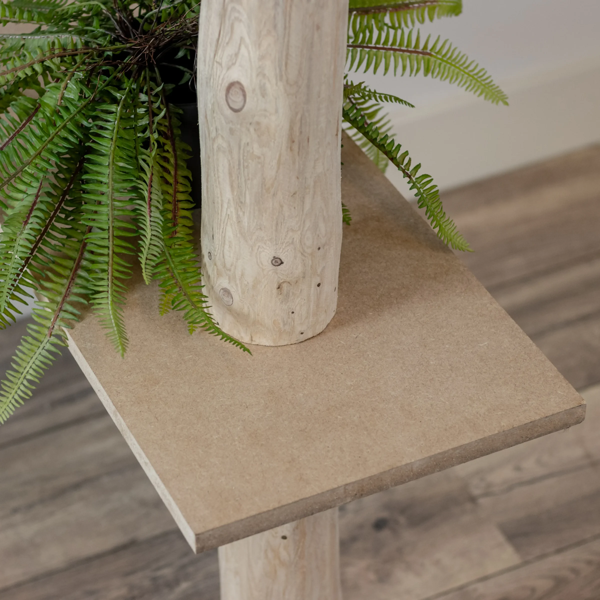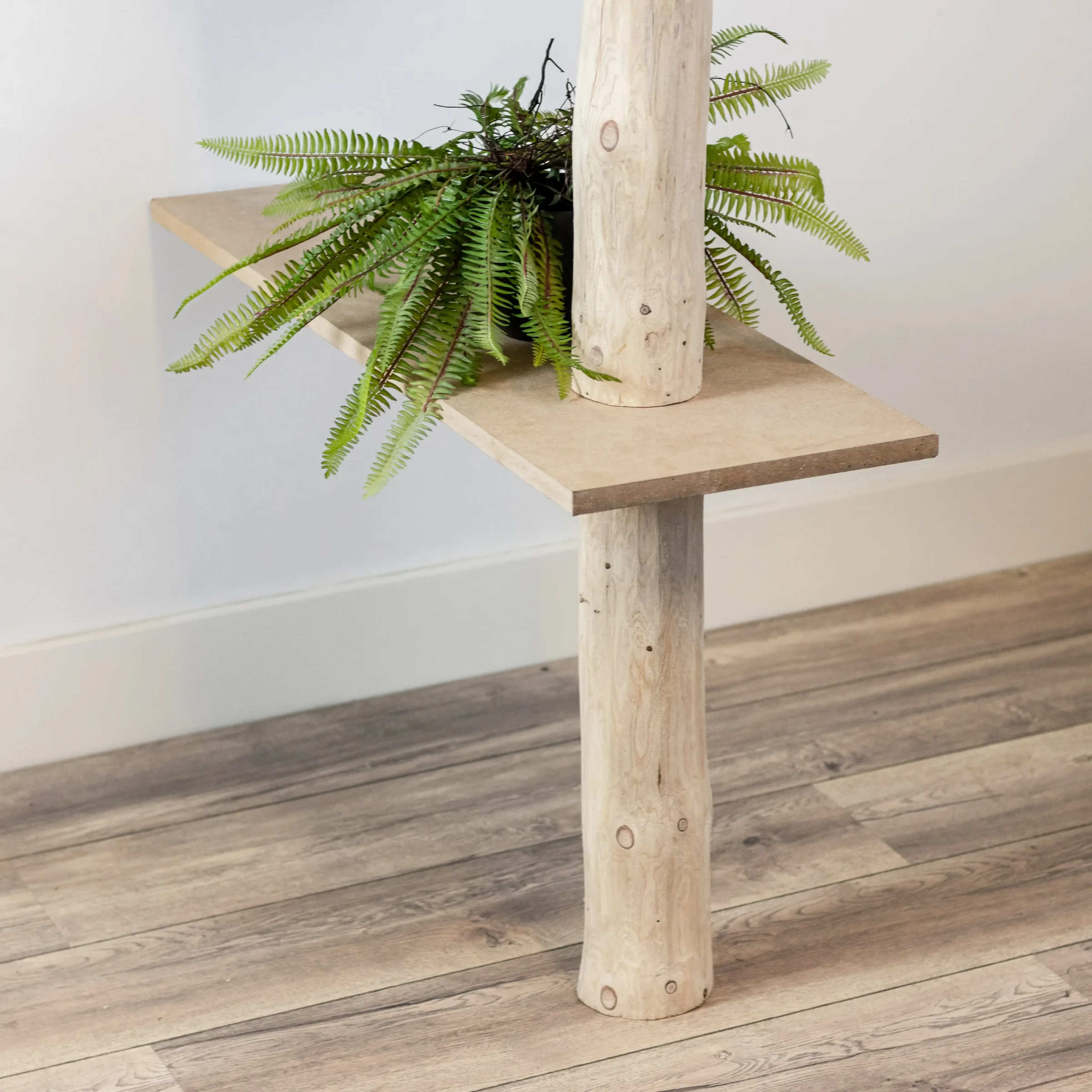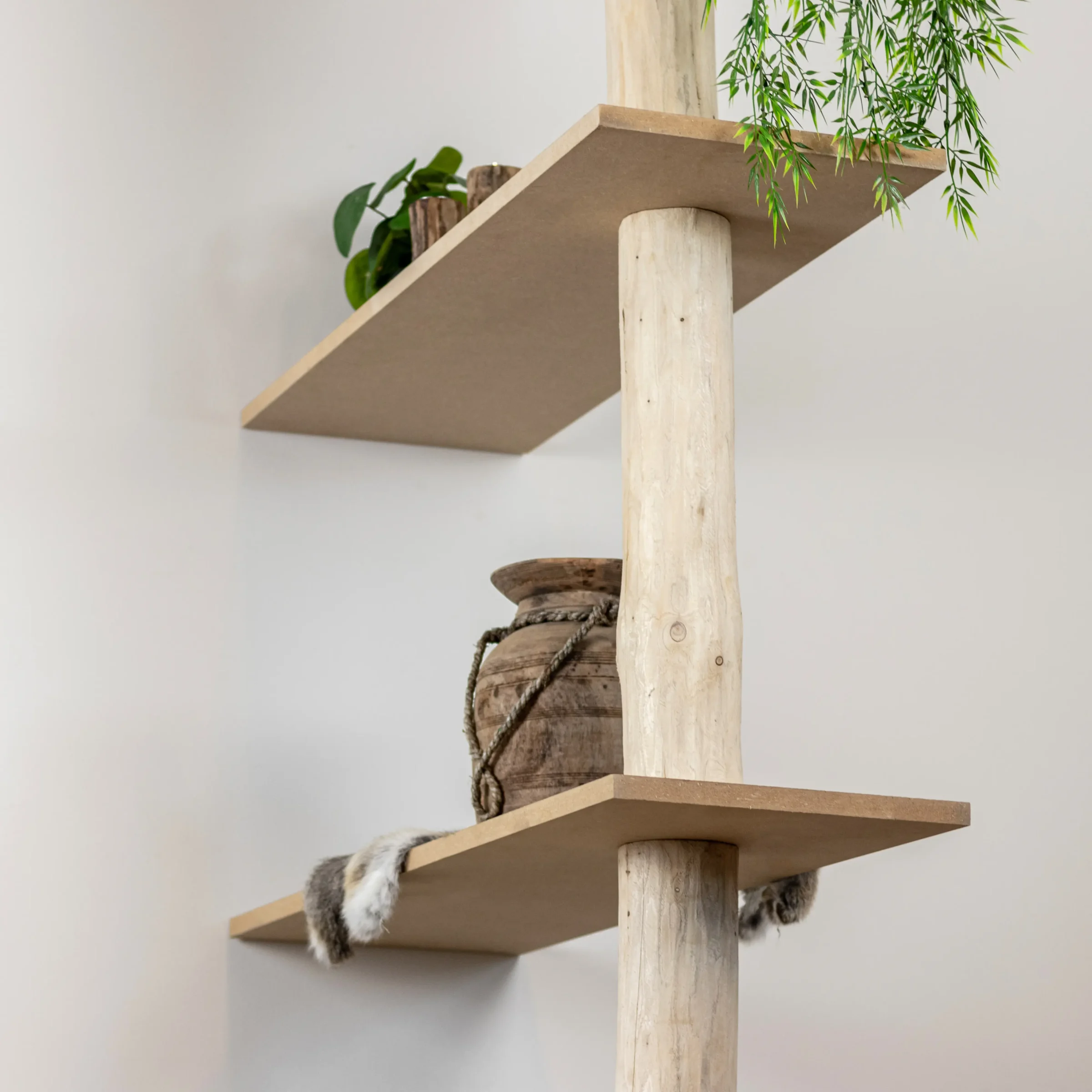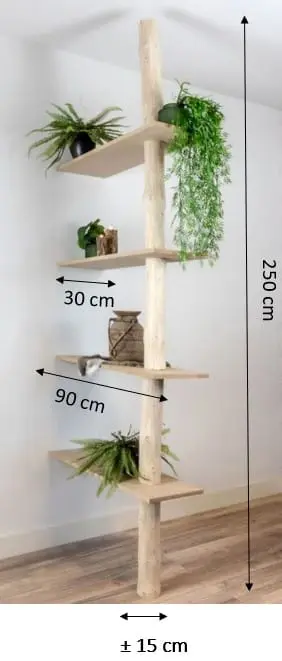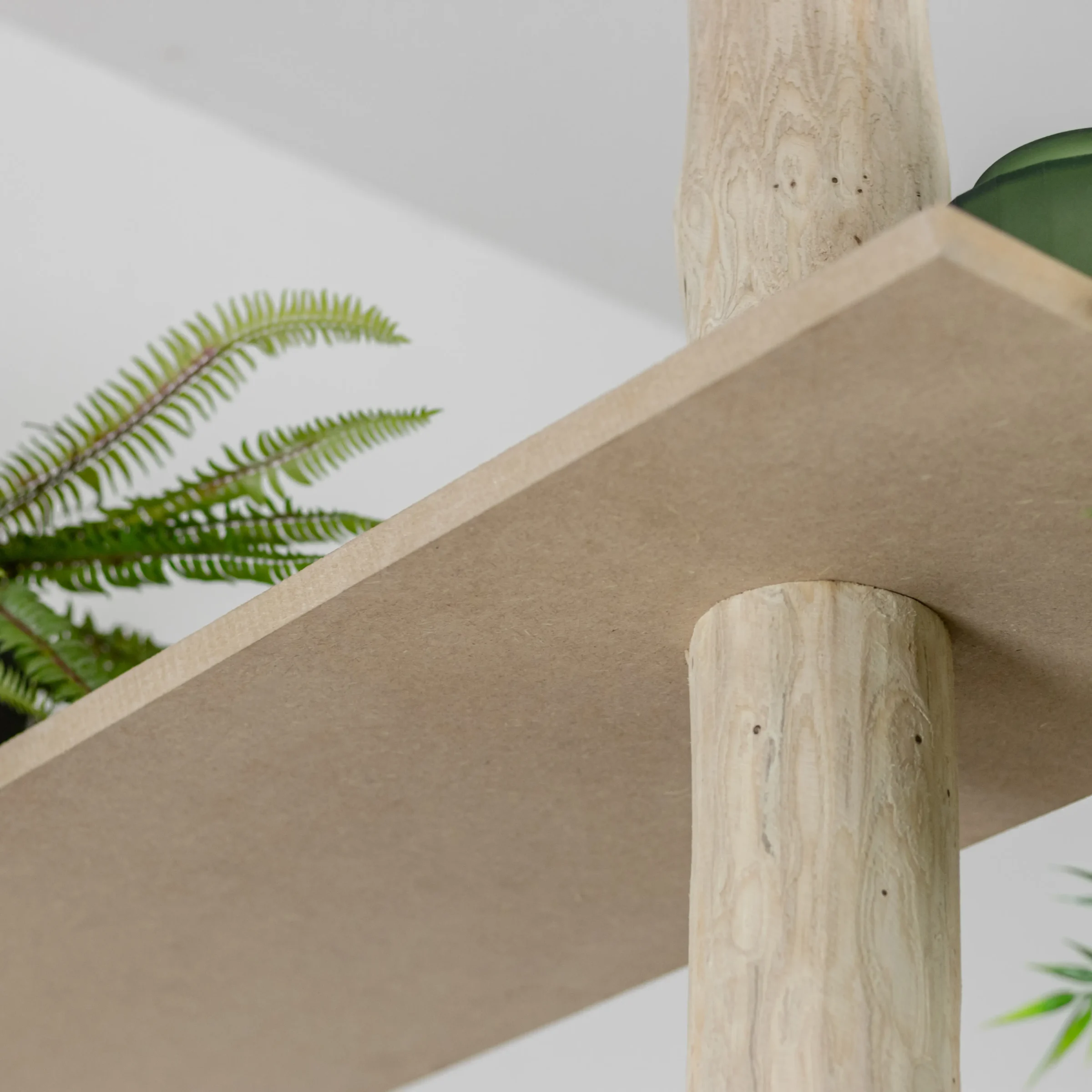 De contrastwerking tussen de organische stam en de strakke, lichte legplanken zorgt voor een krachtige eyecatcher die de ruimte verdeelt zonder licht en zicht te blokkeren. De open niveaus bieden volop plek voor planten, boeken en decoratie, waardoor je eenvoudig sfeer aan beide kanten van de divider creëert. Iedere stam heeft zijn eigen vorm, waardoor elk exemplaar uniek is en subtiel anders oogt.