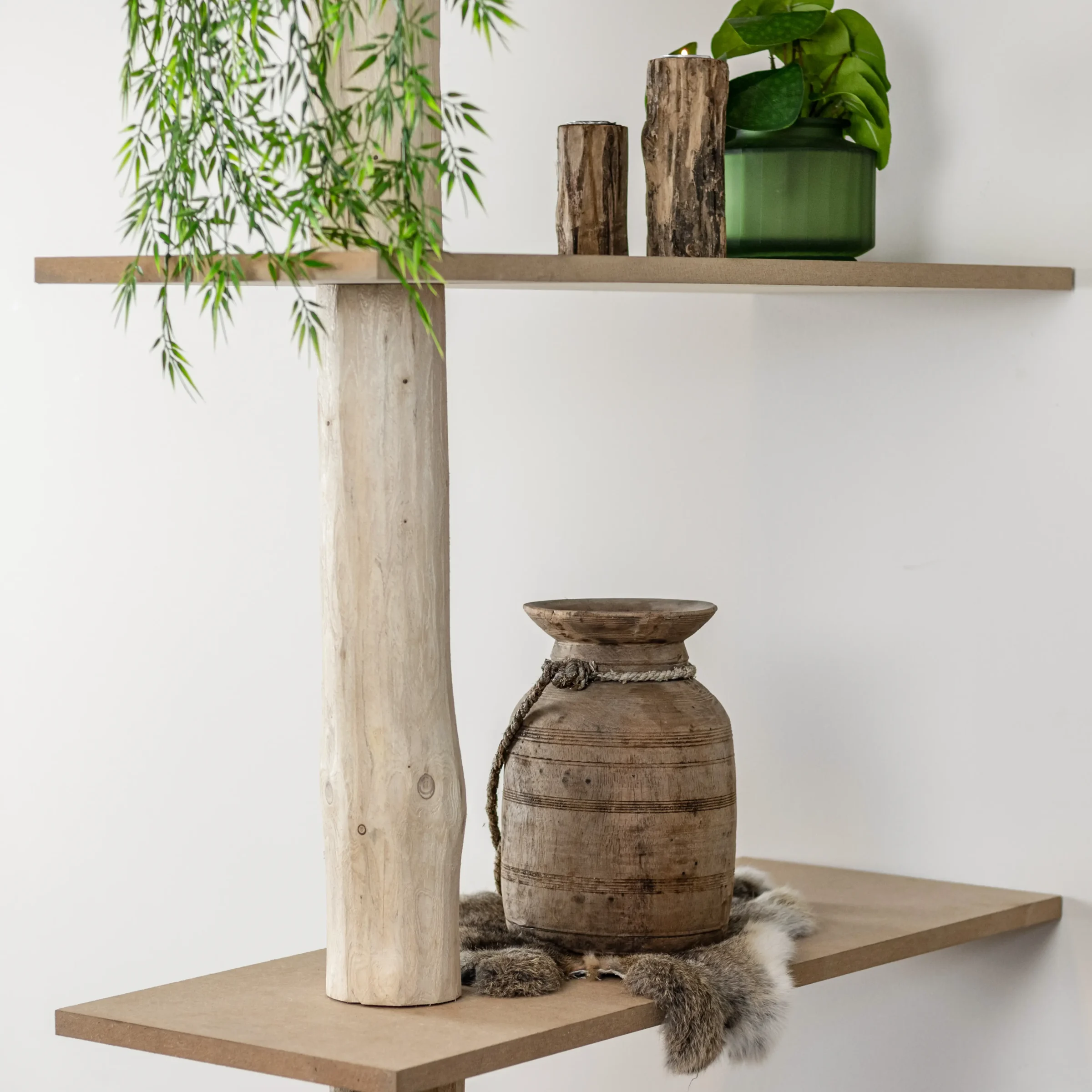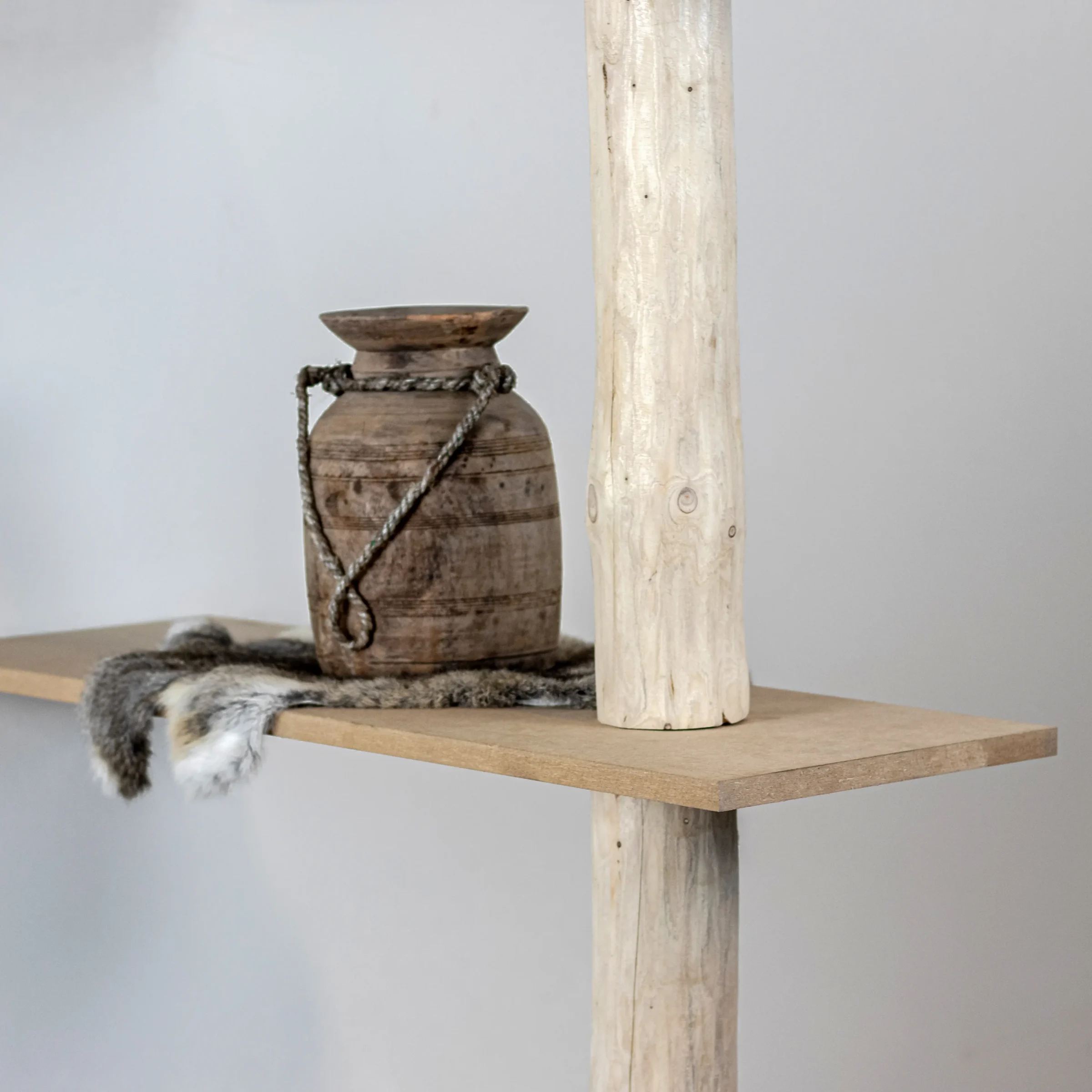 Deze roomdivider brengt het beste van twee werelden samen: een lichte, geschuurde boomstam met zichtbare nerf en noesten als verticale drager, gecombineerd met strak vormgegeven planken van MDF.