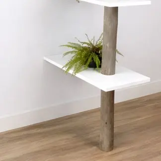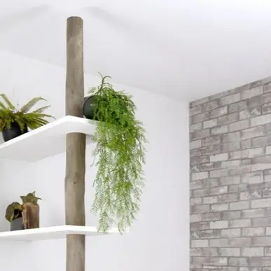 De contrastwerking tussen de organische stam en de strakke, witte legplanken zorgt voor een krachtige eyecatcher die de ruimte verdeelt zonder licht en zicht te blokkeren. De open niveaus bieden volop plek voor planten, boeken en decoratie, waardoor je eenvoudig sfeer aan beide kanten van de divider creëert. Iedere stam heeft zijn eigen vorm, waardoor elk exemplaar uniek is en subtiel anders oogt.
