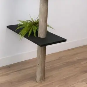 De contrastwerking tussen de organische stam en de strakke, zwarte legplanken zorgt voor een krachtige eyecatcher die de ruimte verdeelt zonder licht en zicht te blokkeren. De open niveaus bieden volop plek voor planten, boeken en decoratie, waardoor je eenvoudig sfeer aan beide kanten van de divider creëert. Iedere stam heeft zijn eigen vorm, waardoor elk exemplaar uniek is en subtiel anders oogt.