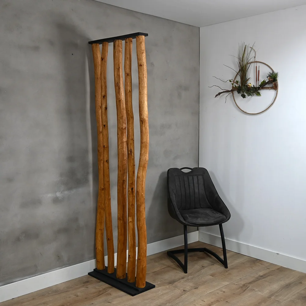 De stevige zwarte voet zorgt voor stabiliteit én een krachtig contrast met de naturel gekleurde stammen. Het resultaat is een divider die niet alleen functioneel is als afscheiding, maar ook een echte blikvanger vormt in huis, kantoor of horeca.