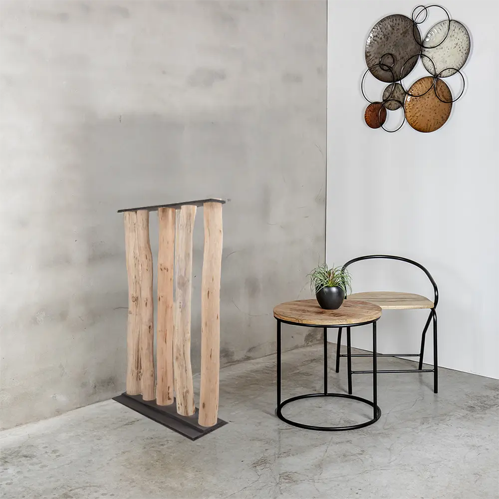 De stammen zijn stevig geplaatst in een zwarte houten voet, wat het geheel een strakke, stoere look geeft. Met zijn tijdloze en minimalistische ontwerp is deze roomdivider ideaal als stijlvolle afscheiding tussen leefruimtes, of als decoratief element dat sfeer toevoegt aan kantoor, horeca of showroom.