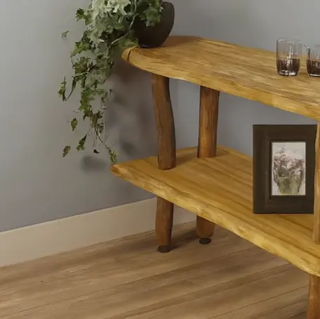 De roomdivider Einar combineert natuurlijke boomstammen met warme, geschuurde loofhouten planken. Zowel de stammen als de planken zijn behandeld met een Old Naturel olie, wat de kast een sfeervolle uitstraling geeft.