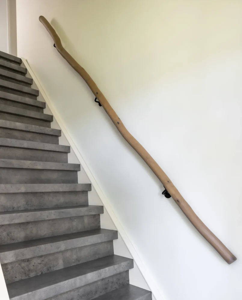 De rechte trapleuning is met zorg geselecteerd op een rustige vorm, maar blijft altijd licht organisch — nooit volledig kaarsrecht, want elke stam behoudt zijn natuurlijke karakter. De gekronkelde variant is juist gekozen op extra mooie bochten en speelse lijnen, ideaal voor wie de charme van puur natuur nog sterker wil benadrukken. Voor trappen met een bijzondere vorm kan de leuning ook met een op maat gemaakte buiging worden geleverd, zodat deze perfect aansluit.