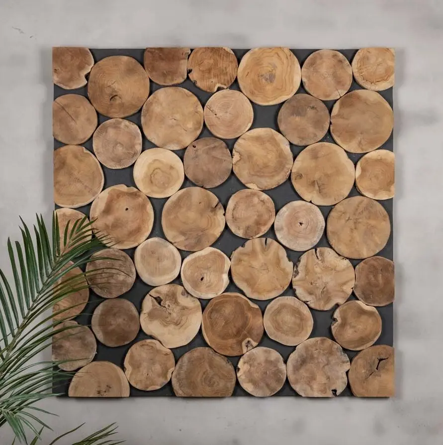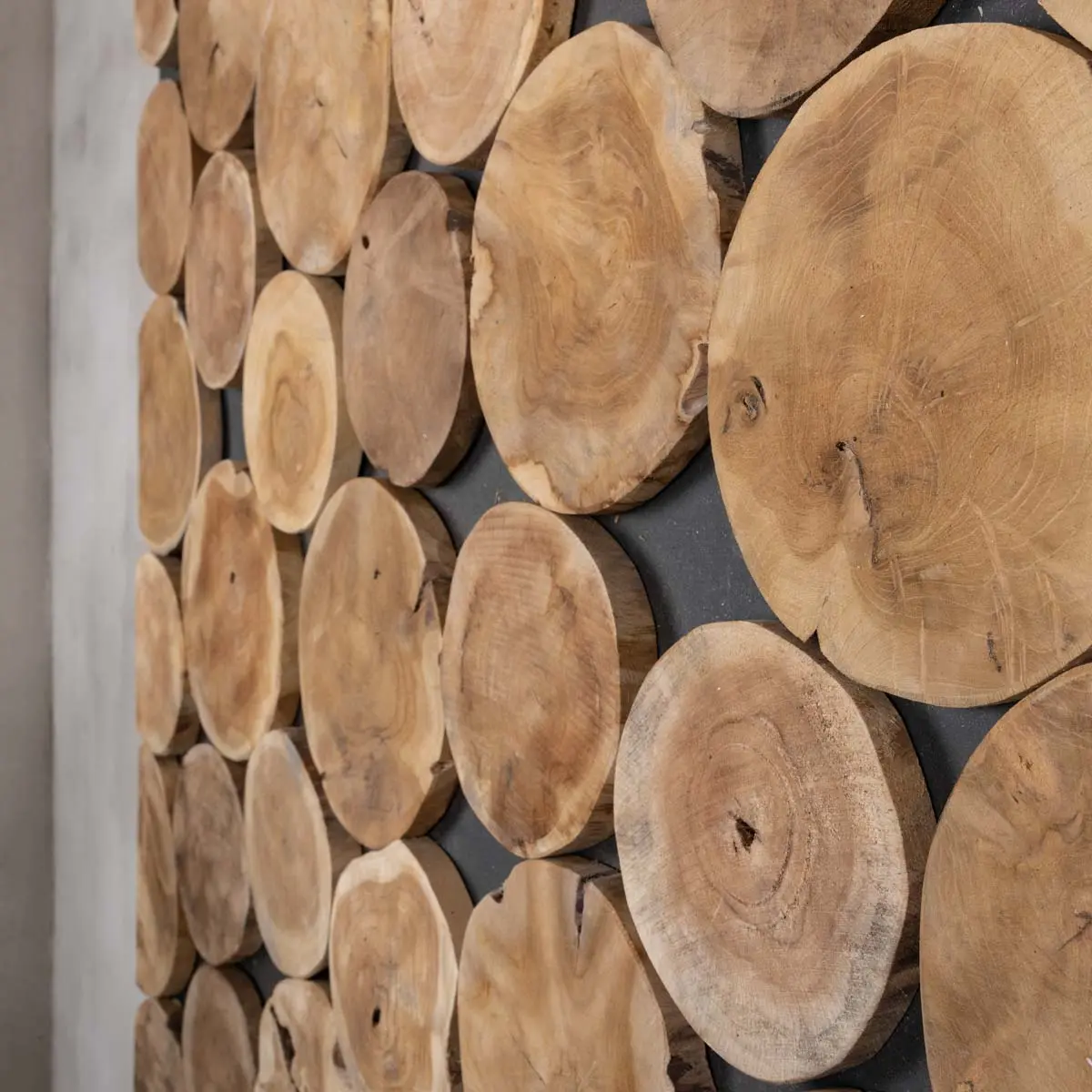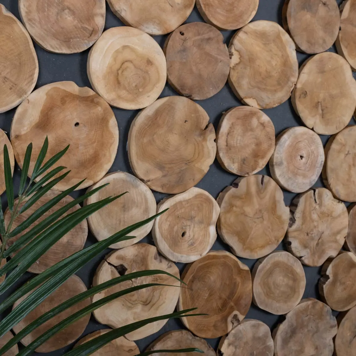 De boomstam wanddecoratie Bjorn is een stoer en stijlvol statement voor elke wand. Dit unieke paneel is opgebouwd uit massieve teakhouten schijven, elk met een diameter van circa 20 tot 25 cm. De warme tinten en natuurlijke nerven van het teak zorgen voor een robuuste, sfeervolle uitstraling.