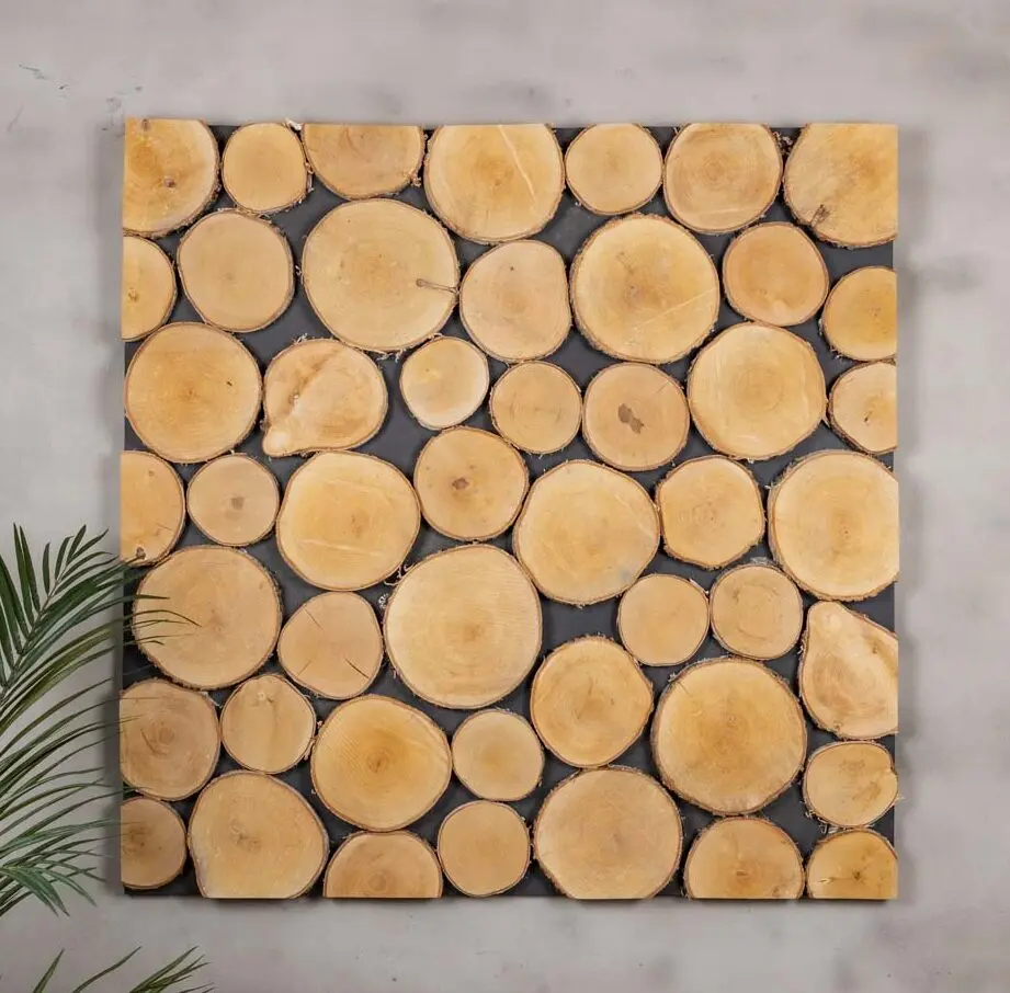Elke schijf is zorgvuldig geselecteerd en bevestigd op een stevige ondergrond, waardoor een harmonieus geheel ontstaat. De natuurlijke kleur van het berkenhout combineert prachtig met het donkere contrast van de achtergrond, wat de tekening van het hout extra laat spreken.