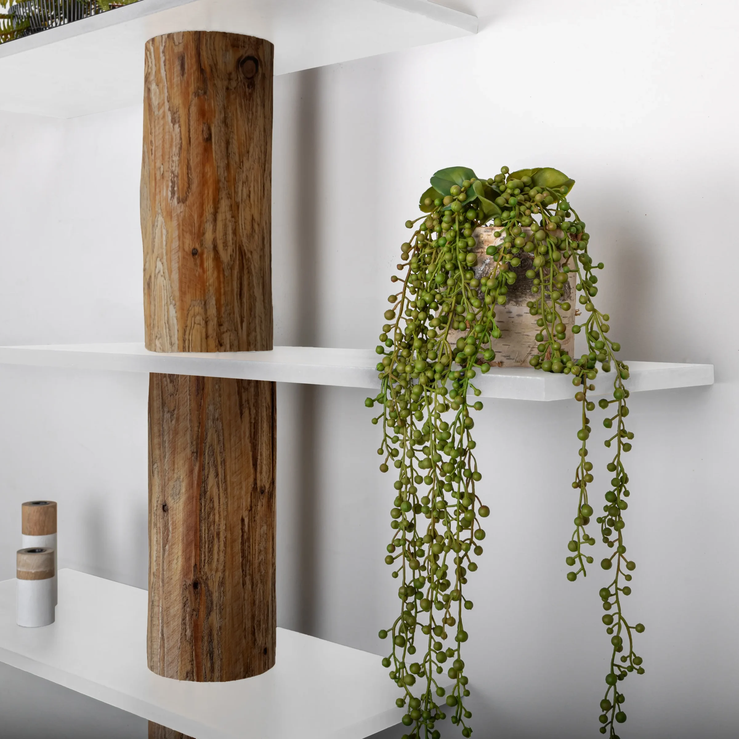 Wandkast Alrik combineert de warmte van echt hout met het grafische effect van witte planken. De planken zijn verspringend geplaatst voor een speels, ruimtelijk ritme en bieden genoeg plek voor boeken, planten en decor. De massieve boomstam vormt de natuurlijke ruggengraat en is afgewerkt met een warme Oak olie, wat zorgt voor een sfeervolle uitstraling.