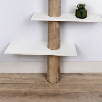 Wandkast Javi combineert de warmte van echt hout met het grafische effect van strakke, witte planken. Een echte boomstam vormt de verticale ruggengraat en afgewerkt met een Grey wash olie krijgt hij een warme en sfeervolle look; zijn organische vorm contrasteert mooi met de strak uitgevoerde planken die rondom de stam lijken te zweven. De planken zijn verspringend geplaatst voor een speels, ruimtelijk ritme en bieden genoeg plek voor boeken, planten en decor.