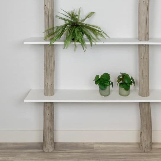 Dit wandrek combineert de authenticiteit van twee natuurlijke boomstammen met de strakke uitstraling van rechte, witte planken. De planken zijn recht geplaatst voor een rustige en symmetrische look. Een echte boomstam vormt de verticale ruggengraat en met zijn organische vorm contrasteert dit mooi met de strak uitgevoerde planken. De massieve stam is afgewerkt met een warme Grey wash olie, waardoor hij extra diepte en karakter krijgt.