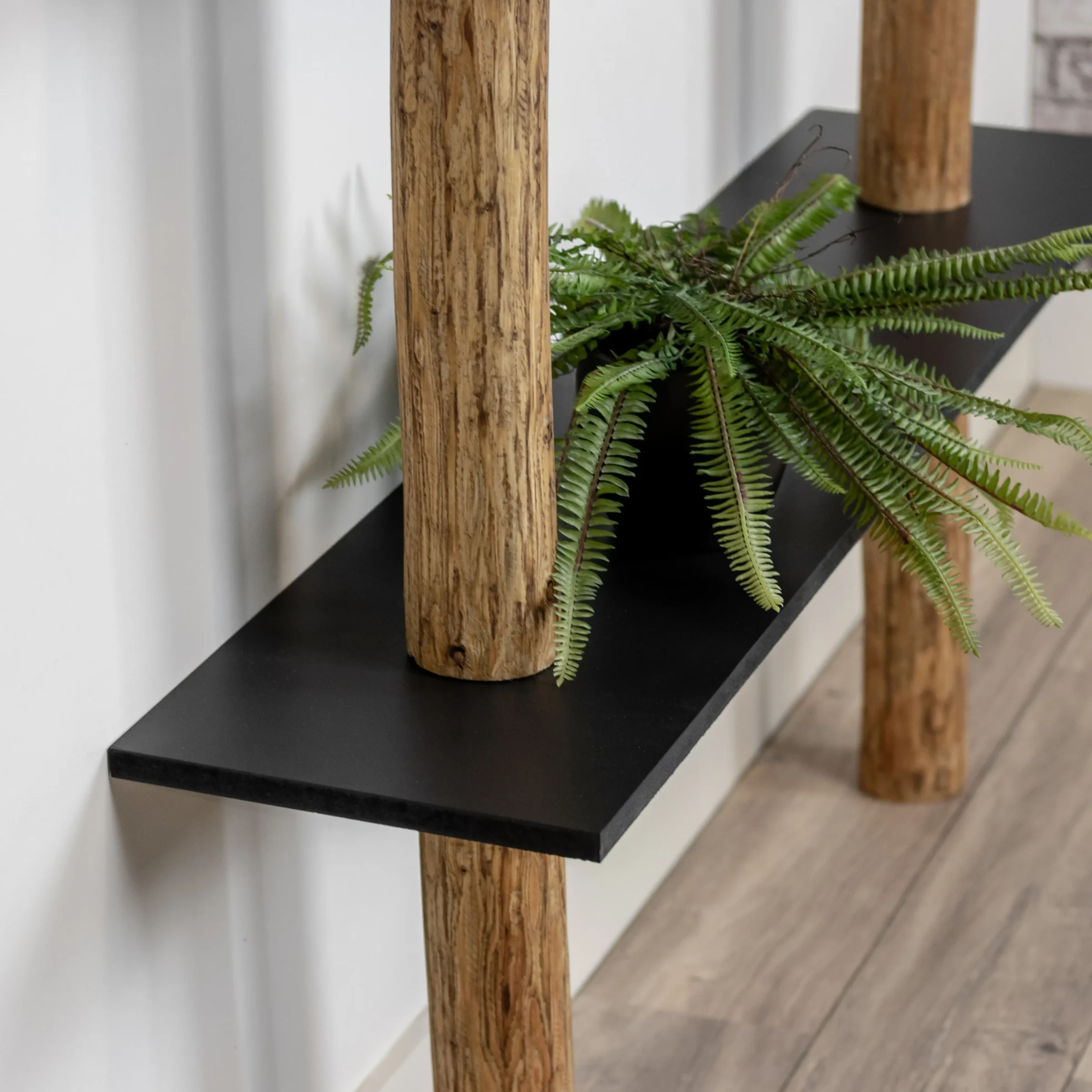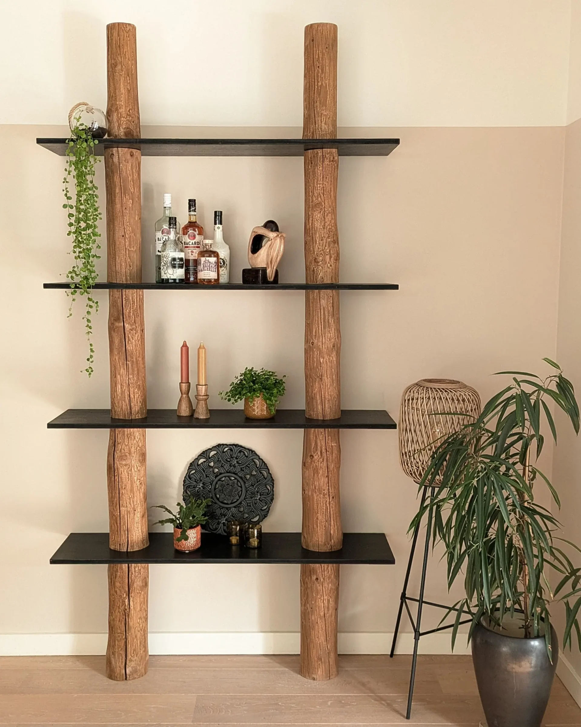 Dit wandrek combineert de authenticiteit van twee natuurlijke boomstammen met de strakke uitstraling van zwarte MDF planken. De planken zijn recht geplaatst voor een rustige en symmetrische look. Een echte boomstam vormt de verticale ruggengraat en afgewerkt met een Oak olie krijgt hij een warme en sfeervolle look; zijn organische vorm contrasteert mooi met de strak uitgevoerde, zwarte planken.