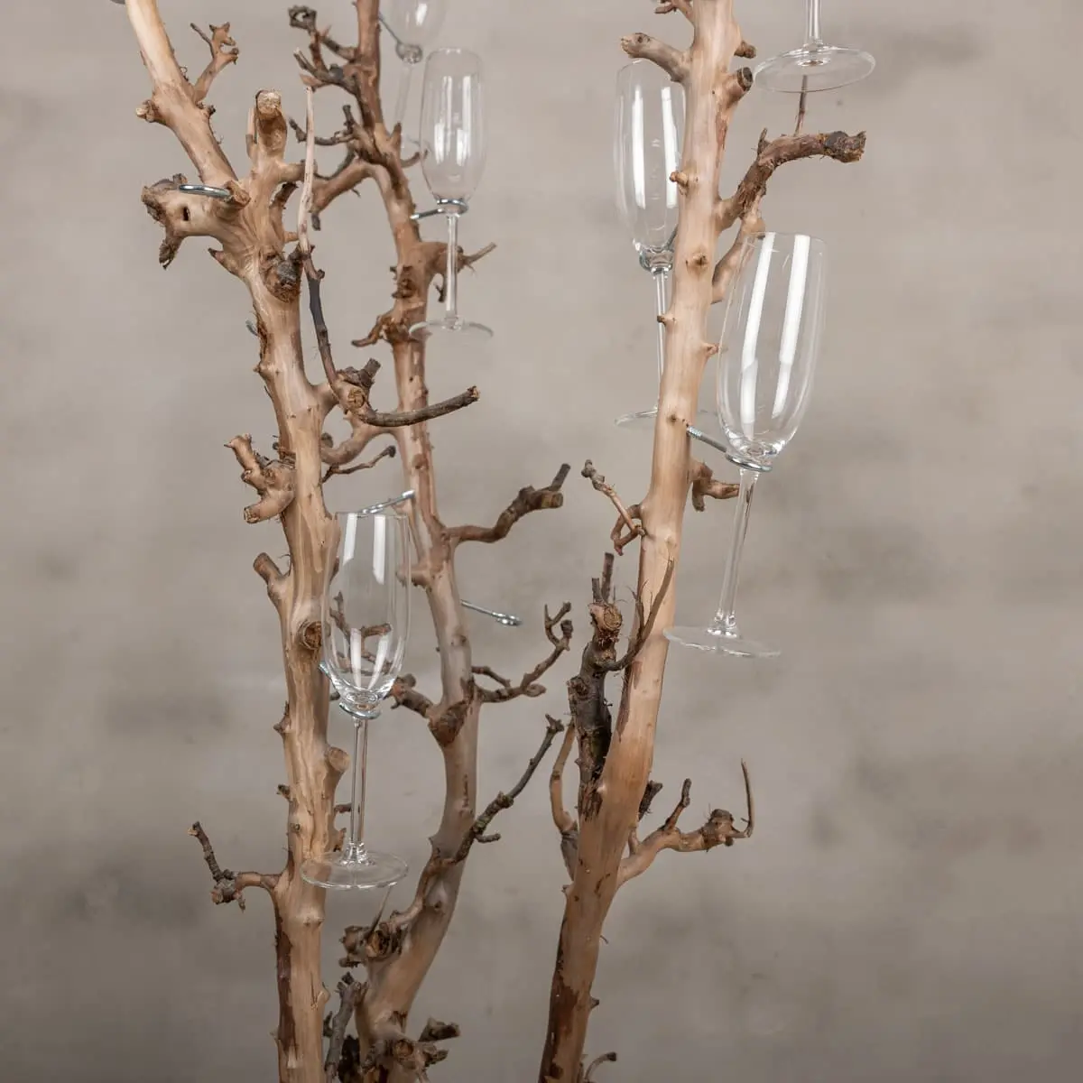 De boom is met de hand gemaakt uit echt perenhout, zorgvuldig geselecteerd op zijn karakteristieke vormen. De stammen zijn volledig ontschorst, waardoor het warme hout en de natuurlijke structuur goed zichtbaar blijven. Verspreid over de takken bevinden zich 35 stevige haakjes, perfect om champagneglazen aan te hangen en zo een exclusieve presentatie te creëren.