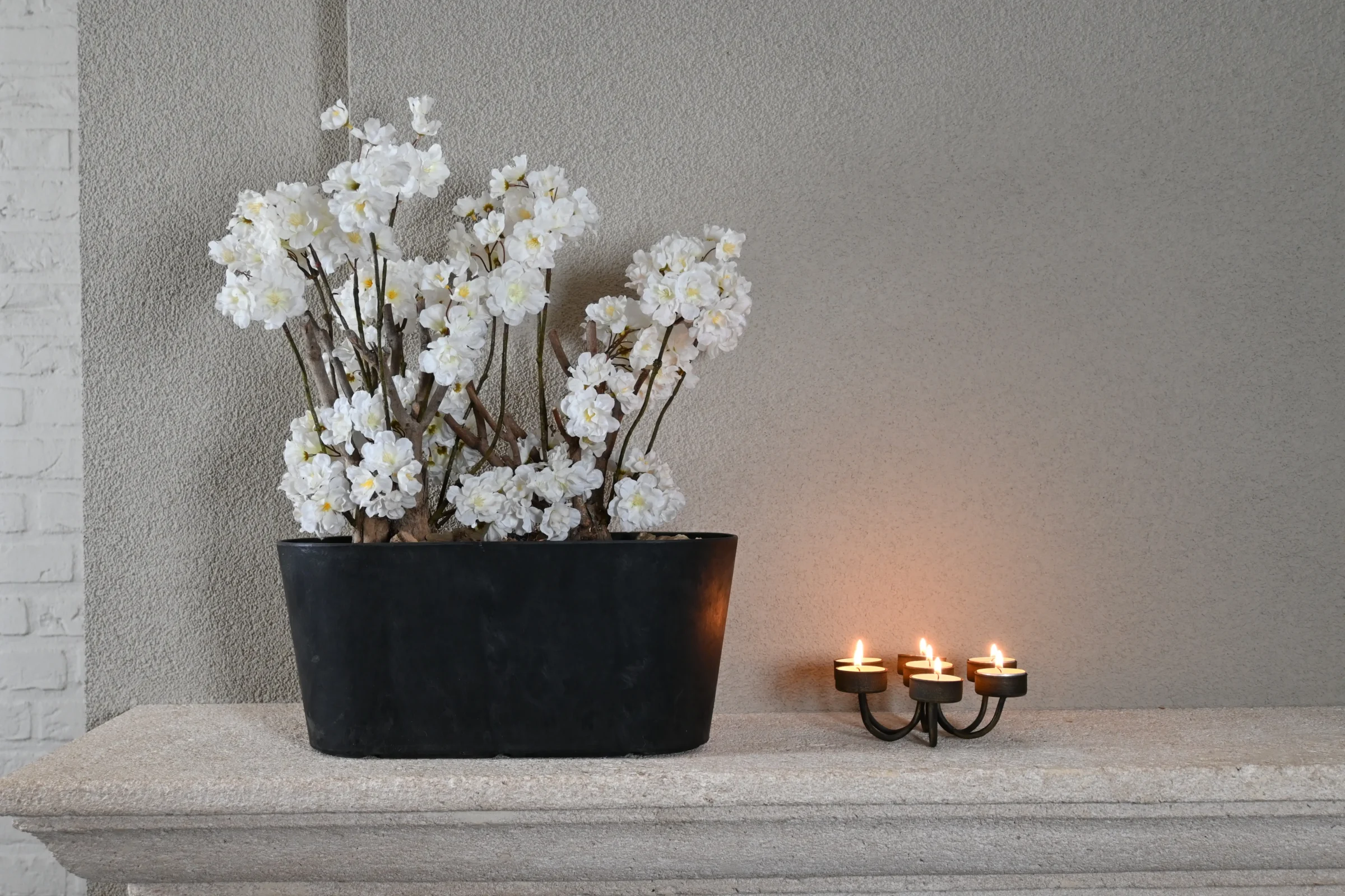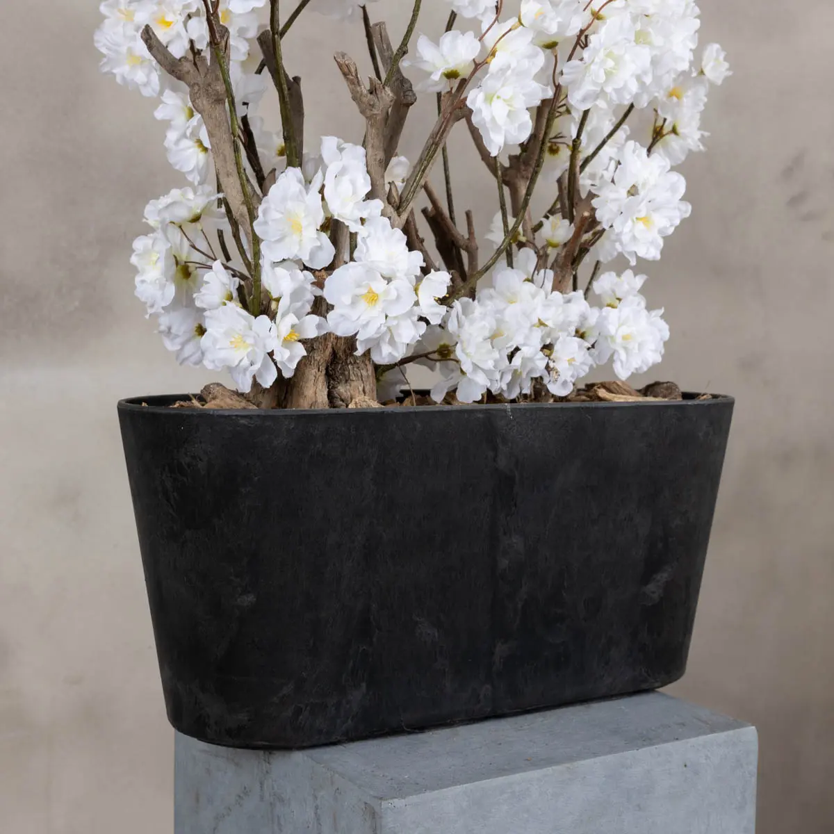 Dit bloemstuk wordt standaard geleverd in een ovale kunststof overpot. Je kunt hierbij kiezen uit de kleuren antraciet, roestkleur of betonlook. Zo combineer je het stuk eenvoudig met jouw interieurstijl.