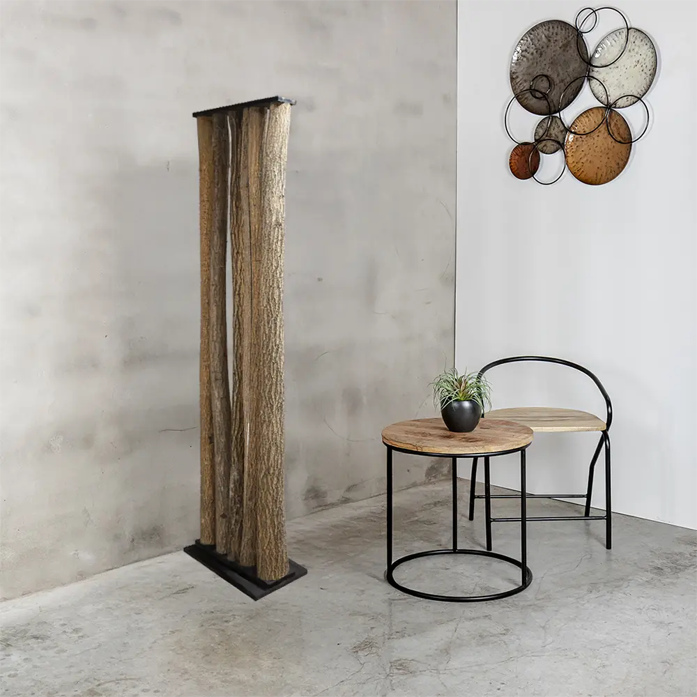 De stammen zijn stevig geplaatst in een zwarte voet, die zorgt voor stabiliteit en een stijlvol contrast met het natuurlijke hout. Deze combinatie maakt de roomdivider geschikt voor zowel landelijke interieurs als moderne ruimtes waar een stoere, organische blikvanger gewenst is.
