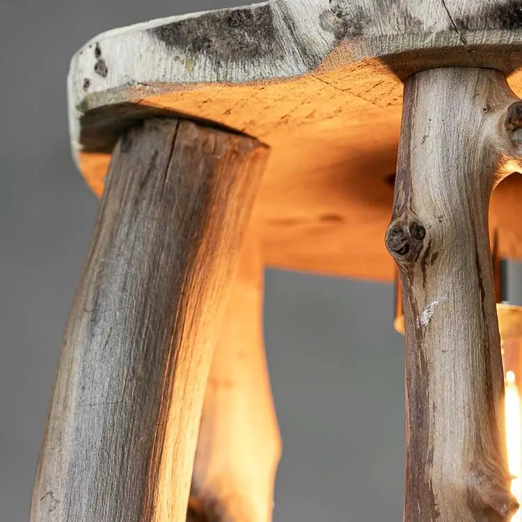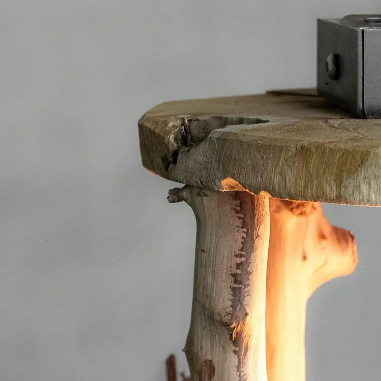 Dankzij het natuurlijke karakter en de ambachtelijke afwerking is geen enkel exemplaar hetzelfde — elke lamp heeft zijn eigen karakter en uitstraling. De combinatie van het ruwe hout en het subtiele licht zorgt voor een warme, sfeervolle gloed in de ruimte.