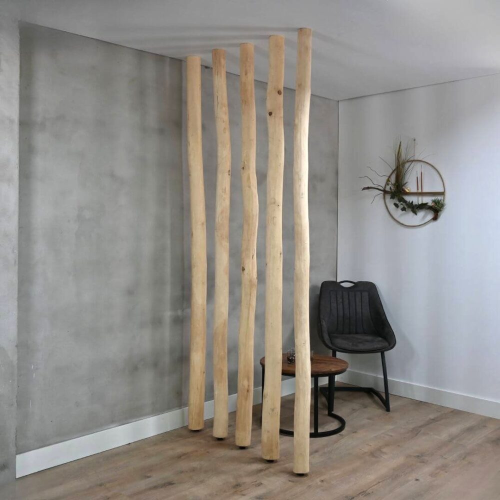 Dankzij de verstelbare stelschroef aan de onderzijde zijn de stammen stevig te plaatsen tussen vloer en plafond — ideaal voor gebruik als roomdivider, wanddecoratie of plantensteun. De hoogte is verstelbaar, waardoor ze geschikt zijn voor vrijwel iedere standaard plafondhoogte.