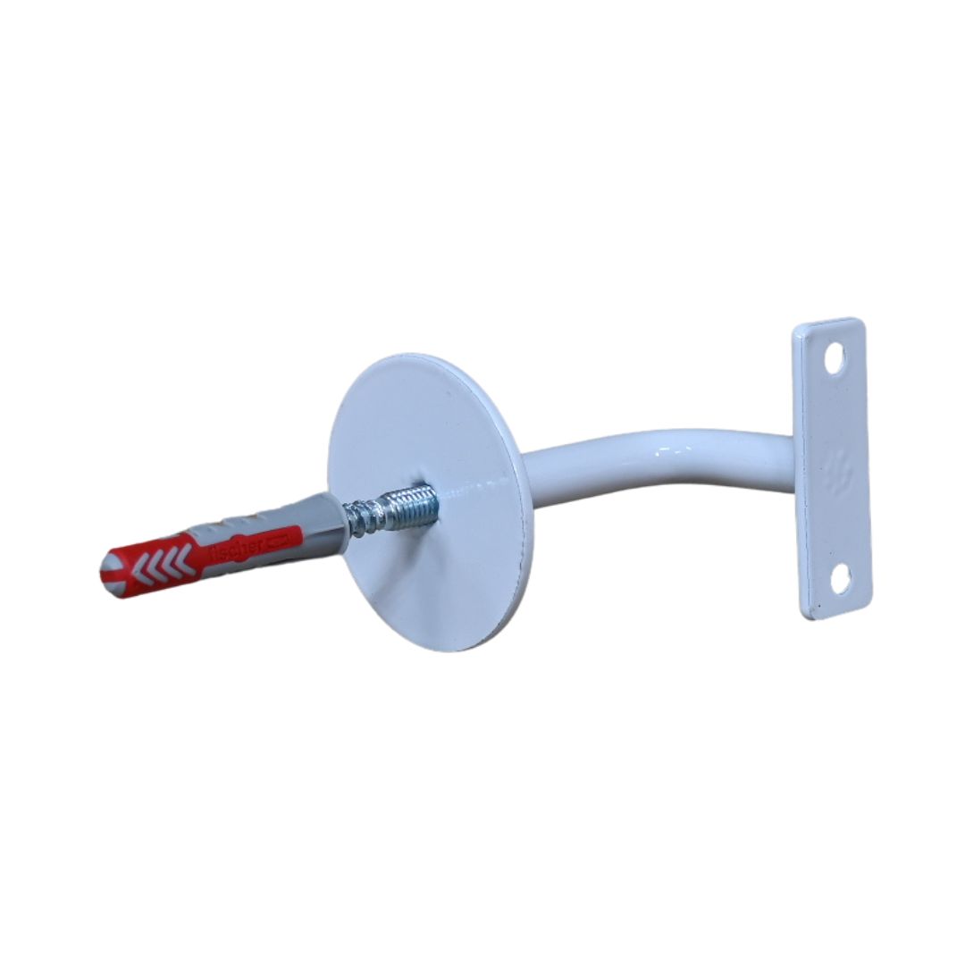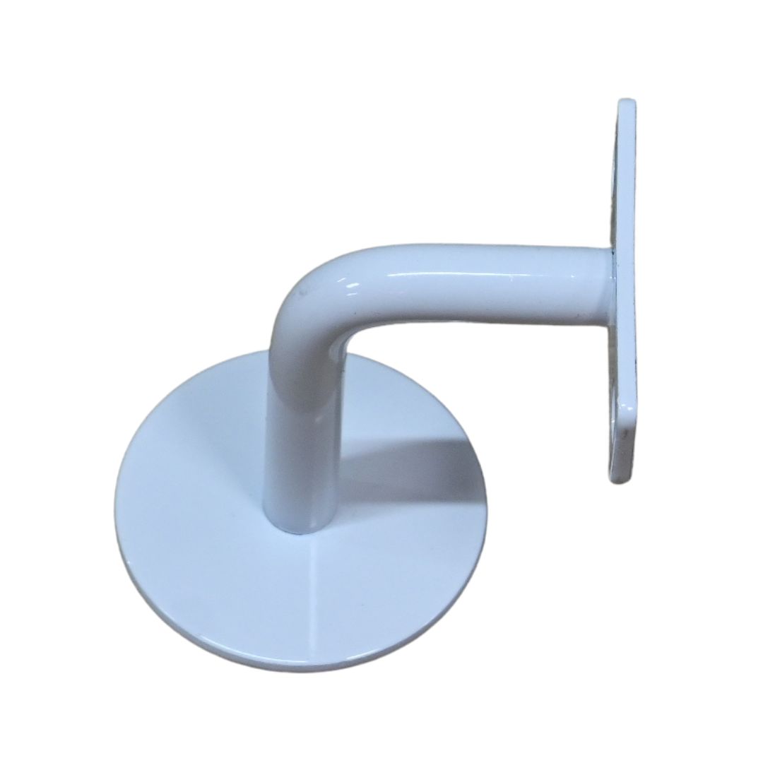 Witte metalen trapleuning houder voor blinde montage tegen de muur, geschikt voor ronde trapleuningen.