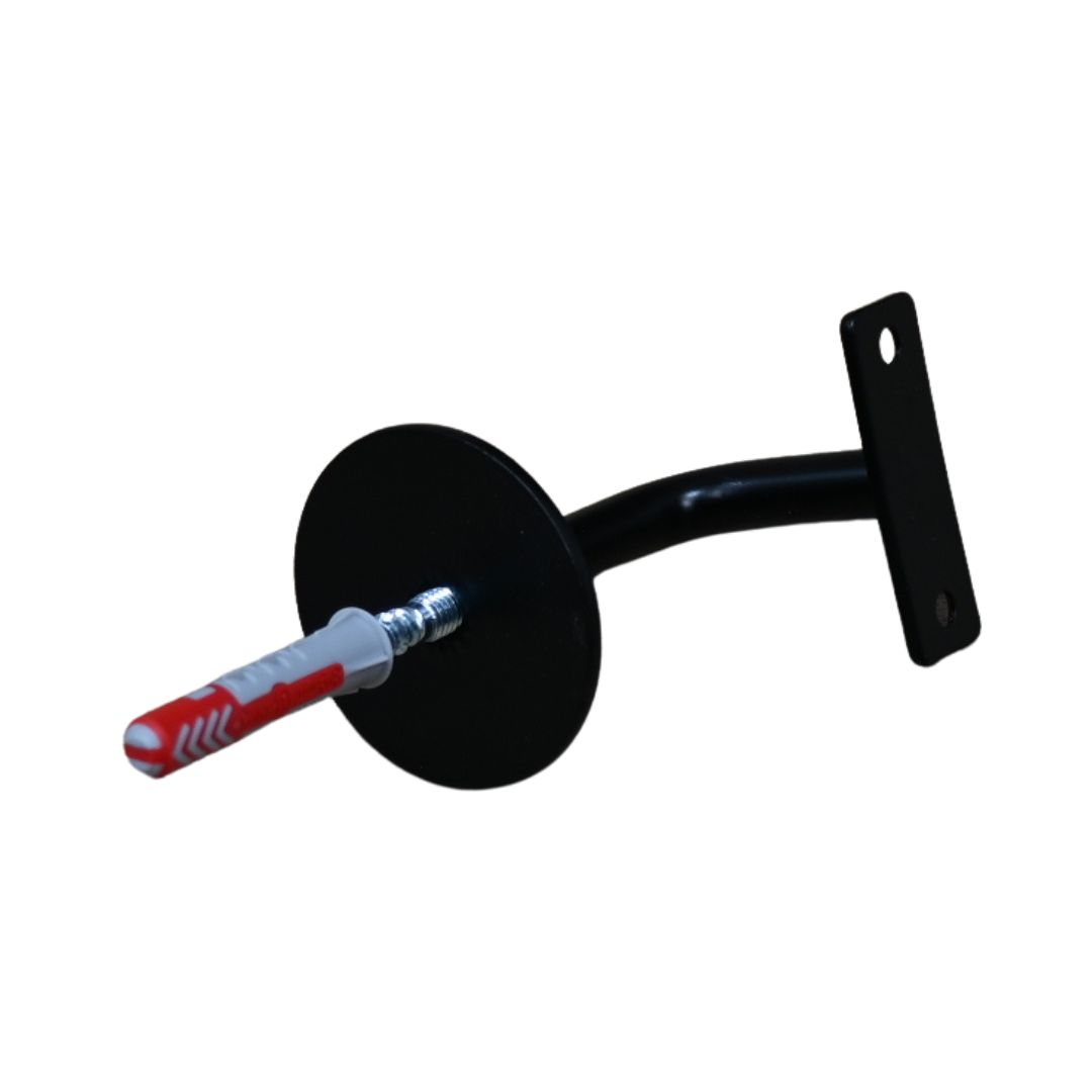 Zwarte metalen trapleuning houder voor blinde montage tegen de muur, geschikt voor ronde trapleuningen.